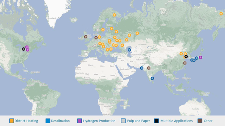 Figure 1: Geographical distribution of past and current demonstrations or commercial systems using nuclear heat for non-electric applications.