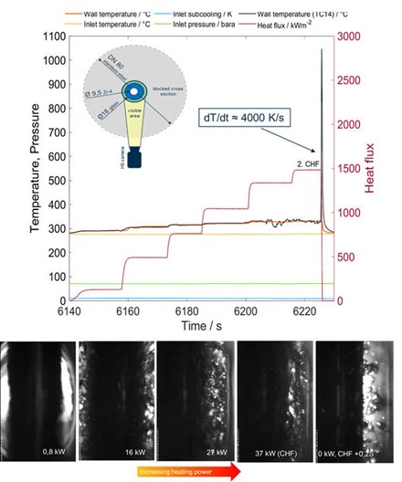 Boiling flow experiment conducted at approximately 80 bar, showing the progression from low heat flux to critical heat flux (CHF). (Top) Time evolution of wall temperature, inlet subcooling, inlet temperature, inlet pressure, and applied heat flux. (Bottom) High-speed camera images showing bubble dynamics at different heating powers.