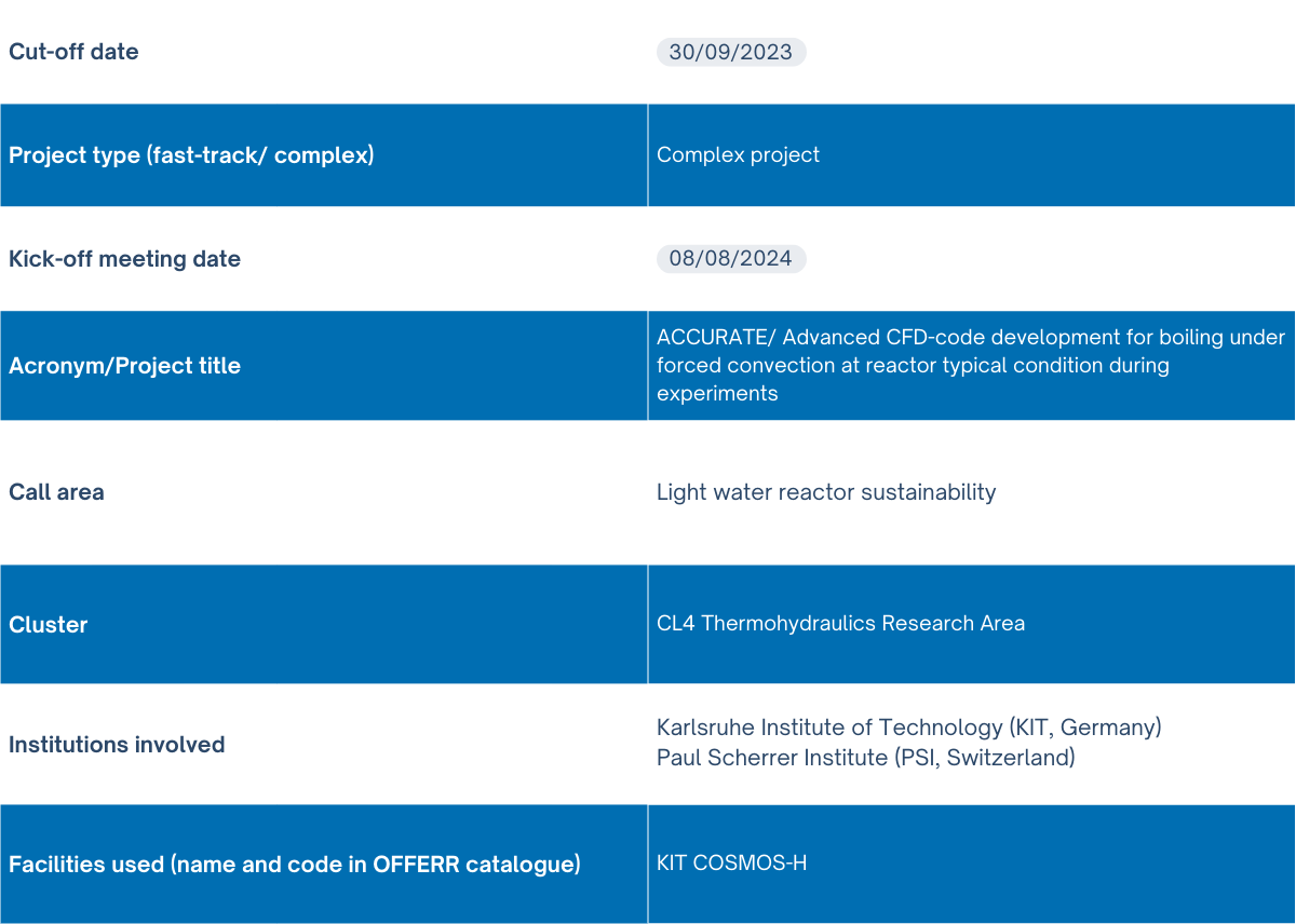 The primary objective of ACCURATE is to establish a validated experimental and computational framework for the study of boiling flows under reactor-typical conditions (70–155 bar, up to 355°C). This requires a dual strategy: enhancing experimental capabilities at the COSMOS-H facility and advancing CFD models for mechanistic prediction of CHF phenomena. On the experimental side, the project will implement two major upgrades: (i) installation of a high-pressure sight glass module with a 45 mm optical window to capture bubble dynamics with high-speed imaging, and (ii) deployment of fiber-optic temperature measurement technology to replace conventional thermocouples, providing high-resolution surface and fluid temperature data. These enhancements will allow unprecedented observation of bubble nucleation, growth, lift-off, and coalescence under prototypical reactor conditions. On the computational side, the project will extend the PSI-Boil code through two complementary approaches: interface-tracking simulations to directly resolve liquid-vapor interfaces and elucidate CHF mechanisms, and Eulerian-based simulations to optimize empirical models for large-scale reactor applications. Experimental data will not only support model calibration but will also be made openly available for the broader nuclear research community. Together, these objectives will lead to a validated CFD tool capable of predictive simulations of boiling flows up to crisis conditions, strengthening reactor safety analyses and supporting the design and operation of future light water and modular reactors.