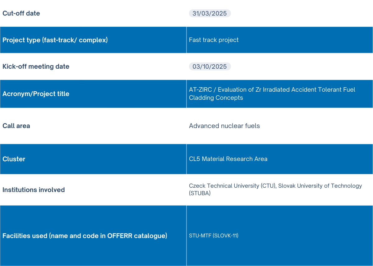 The project aims to evaluate the radiation resistance of advanced Accident Tolerant Fuel (ATF) cladding based on chromium-coated Optimized ZIRLO™ under simulated reactor conditions. While zirconium alloys are widely used in light water reactors for their excellent properties, they face limitations during accident scenarios due to their rapid oxidation in steam at high temperatures. Chromium coatings, applied via Physical Vapor Deposition (PVD), are a promising solution, offering enhanced oxidation resistance and mechanical durability.