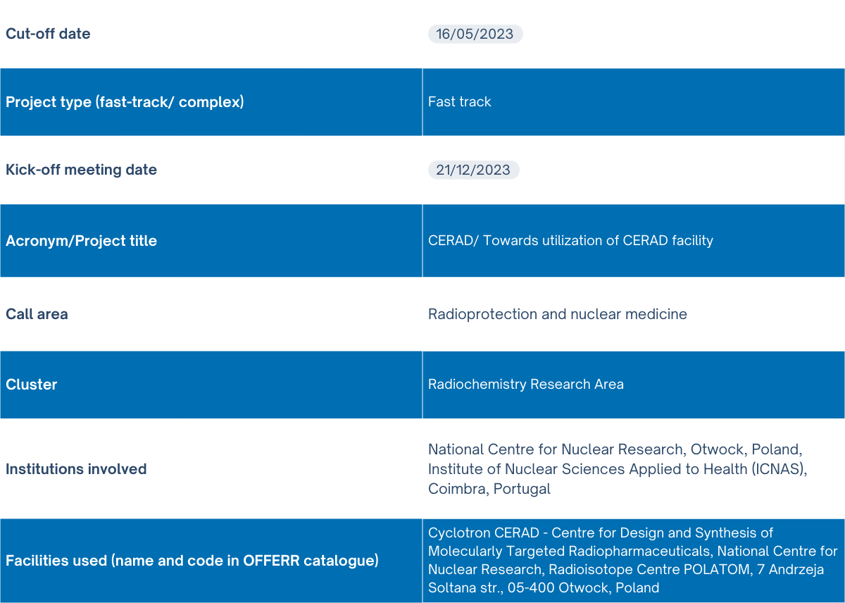 The proposal is on the border of the main scope of OFFERR (nuclear fission), but clearly falls in one of the specified areas: radioprotection and nuclear medicine. It also makes use of the CERAD facilities, which are partly in the nuclear fission field.