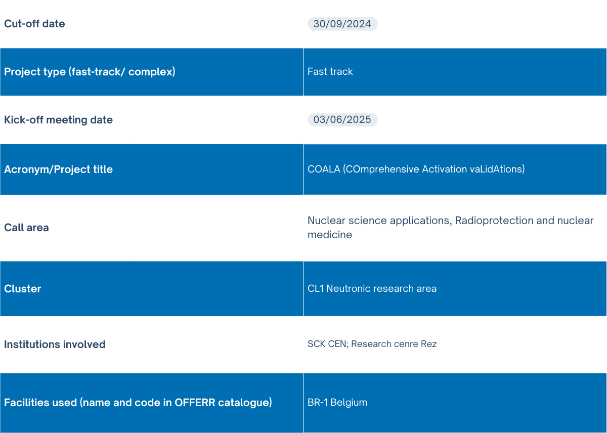 The first part of the project will be performed in the fast field of the BR1 MARK-3 convertor focusing on the validation of the cross sections of selected reactions that are promising in reactor dosimetry: 204Pb(n,n´), 117Sn(n,n´), 64Zn(n,p), 67Zn(n,p), 92Mo(n,p), and 28Si(n,p).