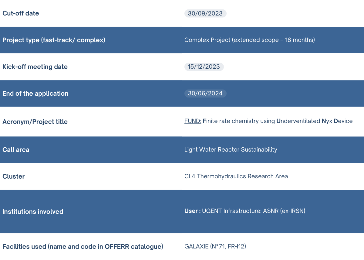 The aim of the FUND Project is to improve the use of numerical simulation tools (Computational Fluid Dynamics (CFD) models) for the assessment of fire risk applications in nuclear fields. In particular, the objective of this study is to develop finite-rate chemistry models that can be used to better predict the so-called under-ventilated combustion regimes, encountered in nuclear facilities (and in buildings and or industries). Nowadays, two of the main challenges for CFD tools for compartment fire modeling are the assessment of the transition to under-ventilated combustion and the numerical capability of the model to predict the presence and concentration of flammable vapors (unburned fuel) inside the fire compartment. In this context of improving fire modeling for nuclear applications, the collaborative FUND project joins the numerical skills of the Ghent University team and the experimental skills of ASNR.