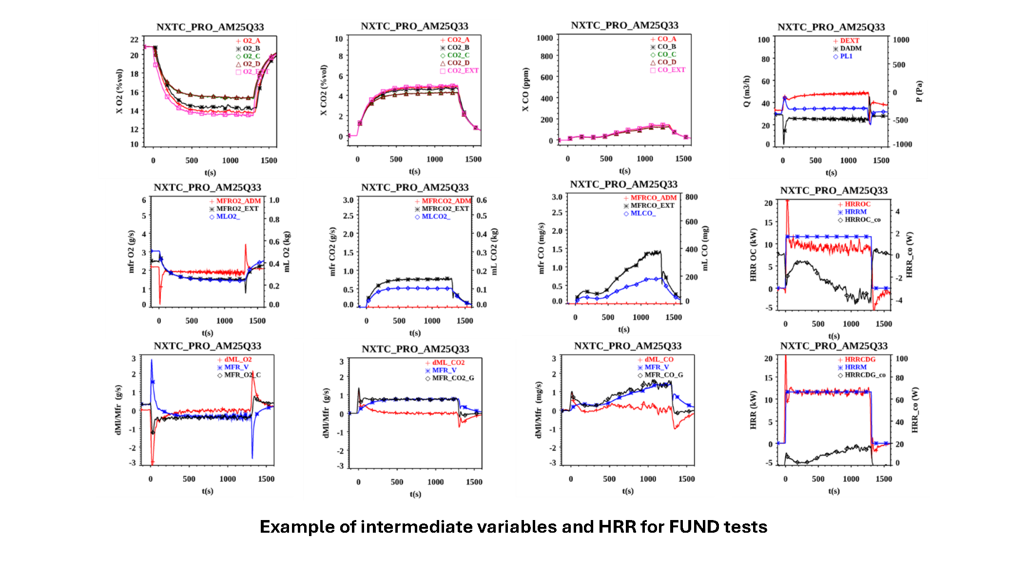 A series of fire tests were carried out using the NYX apparatus. The tests consisted of reproducing the combustion of a propane gas burner in a closed and mechanically ventilated chamber. The test parameters were the propane flow rate, the ventilation flow rate and the position of the air inlet. The test apparatus is instrumented to measure the ventilation flow rates, the propane flow rate, the temperature in the chamber and the concentration of the chemical species O2, CO2 and CO. The duration of the experiment is about 30 minutes.