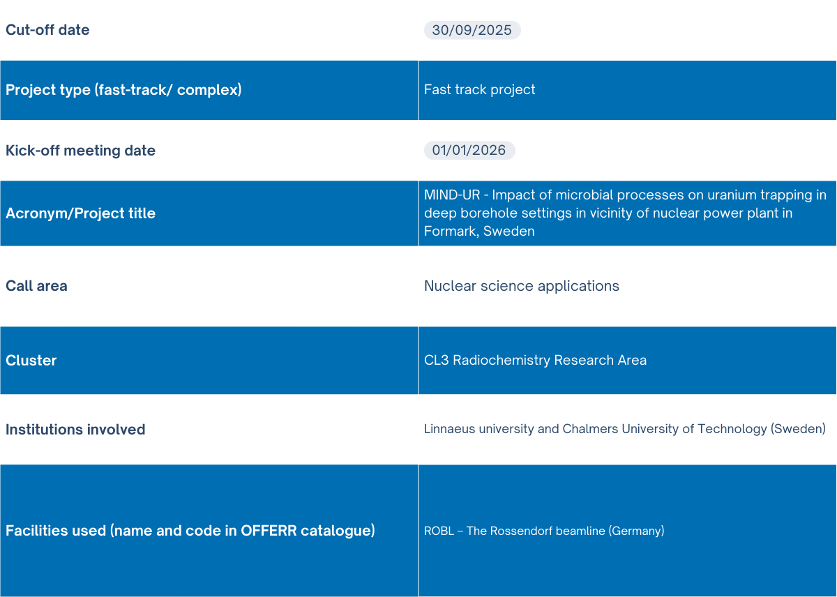 This project investigates the microbial mechanisms behind heavy metal immobilization in deep subsurface environments, with direct relevance to SNF repository safety. Incubation experiments using various metal substrates are being conducted, coupled with advanced micro-scale analyses of metal speciation and distribution. This project requires employment of the infrastructure: synchrotron-based techniques, X-ray fluorescence mapping and high-energy resolution X-ray absorption spectroscopy (ROBL -Rossendorf beamline at ESRF), to determine U redox states and localization in microbial incubates and mineral precipitates from deep borehole samples.