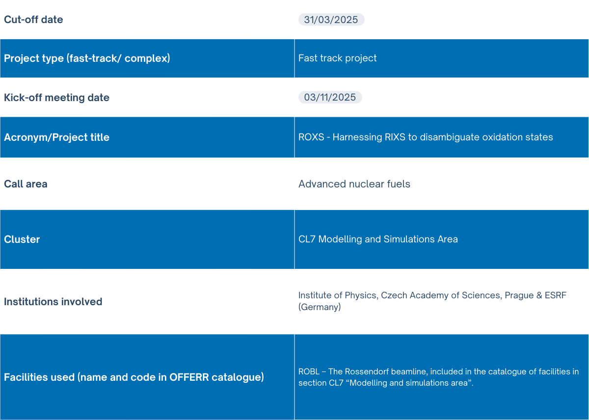 The experimental and theoretical results, and the description of the new method for disentangling the uranium oxidation states will be published in an international peer-reviewed journal(sand the results will be part of presentation(s) at conferences. Given the short span of the project, presentations of the results in the form of a journal paper and the conference talks are likely to happen only after the project itself is concluded. The experimental method will be made available for users at the ROBL beamline.